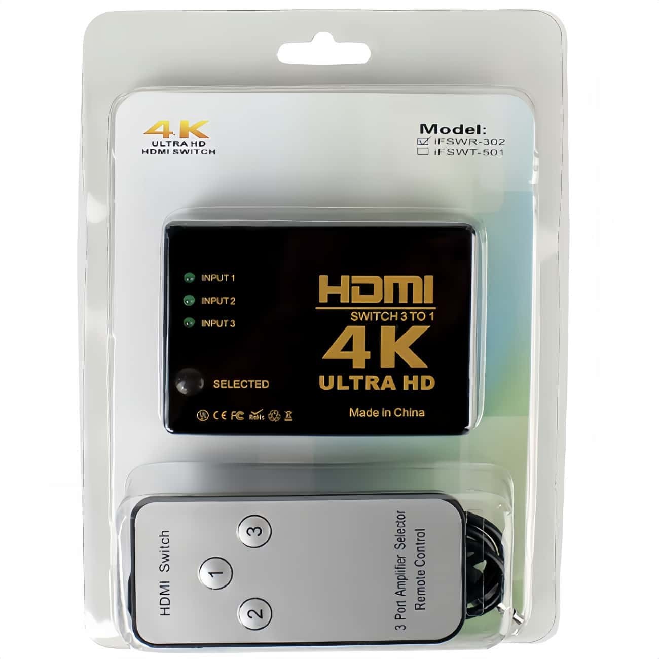 1x HDMI switcher, 1x remote control, 1x blister pack, 1x infrared receiver (optional), 1x USB power cable (optional).