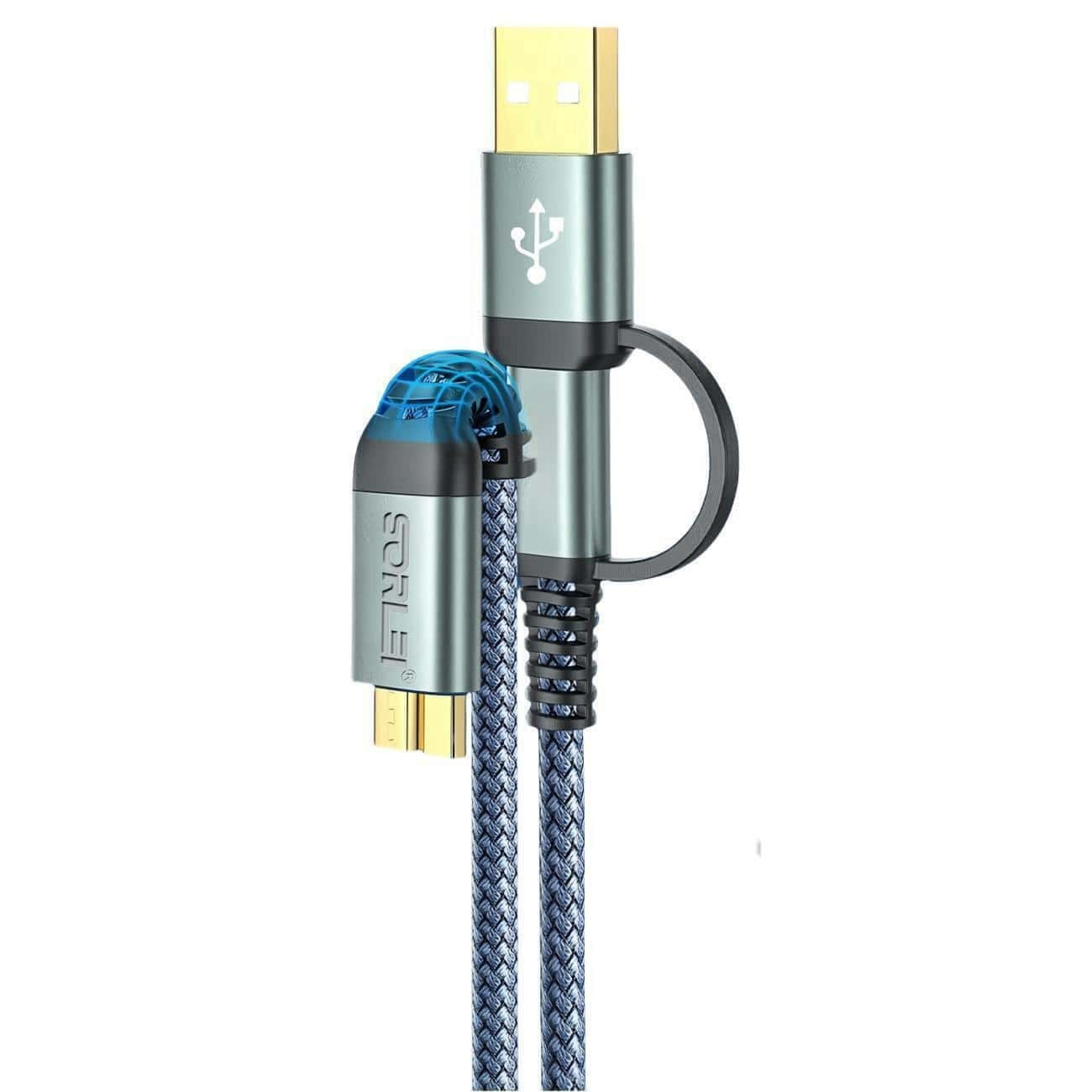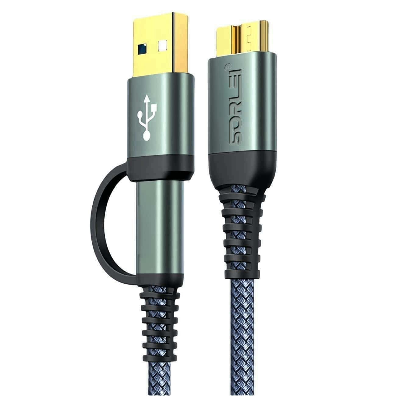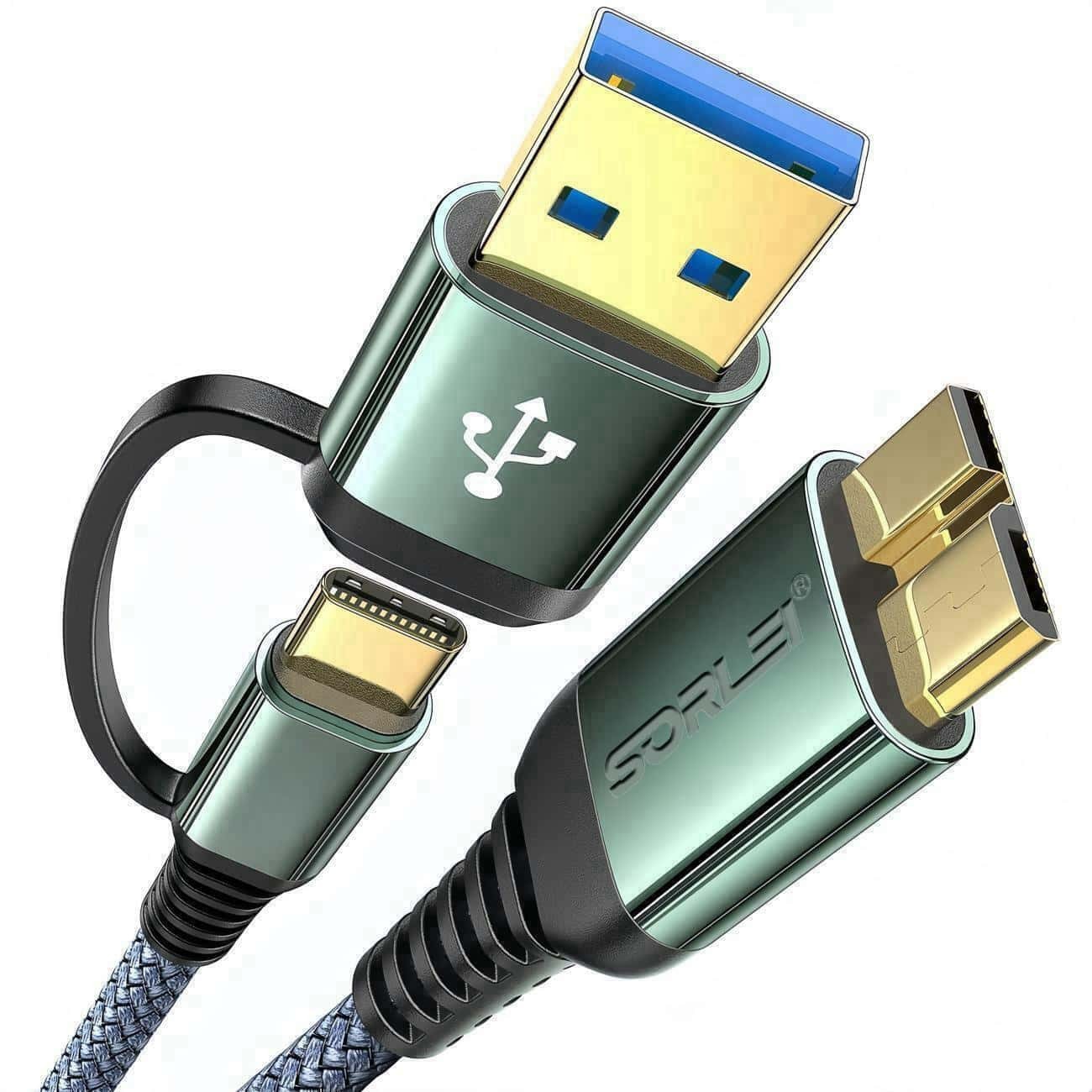 DUAL ADAPTER FOR UNIVERSAL COMPATIBILITY: This micro b to USB C cable can connect all computers with USB Type C port and USB A port. Micro B port can be compatible with USB 3.0 external hard drives including Seagate Toshiba Canvio, and Western Digital (WD) My Passport and Elements hard drives. In addition, it supports data synchronization and charging of smartphones and cameras, such as Samsung S5/Note 3, Galaxy Note Pro 12.2, Nokia Lumia 2520, Canon EOS 5DS/5DSR/5D4 cameras.