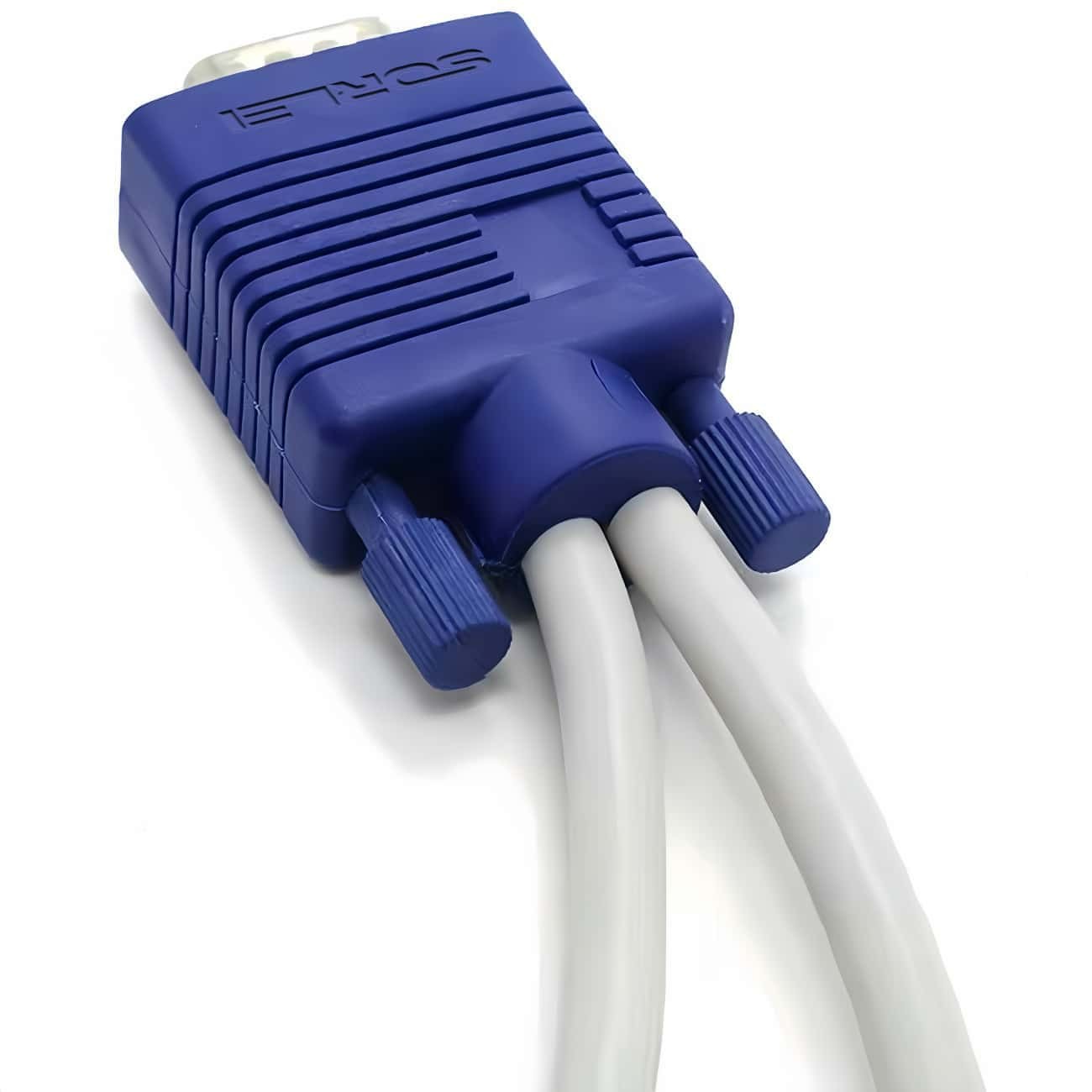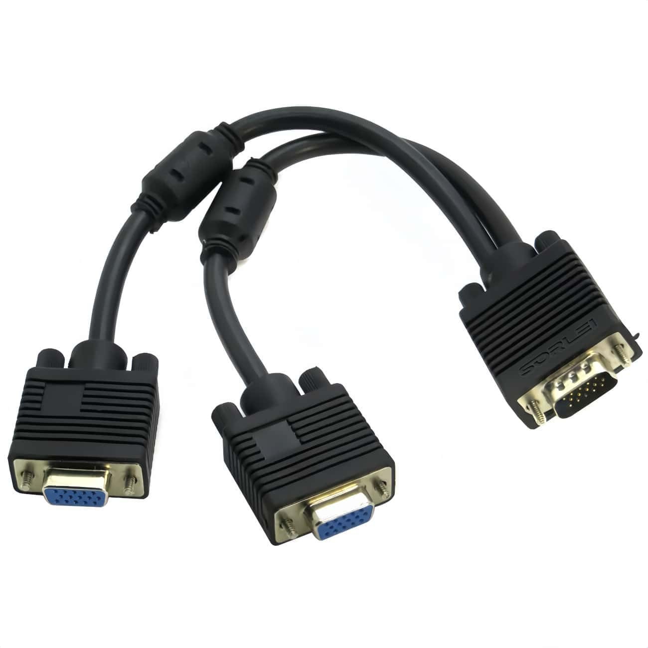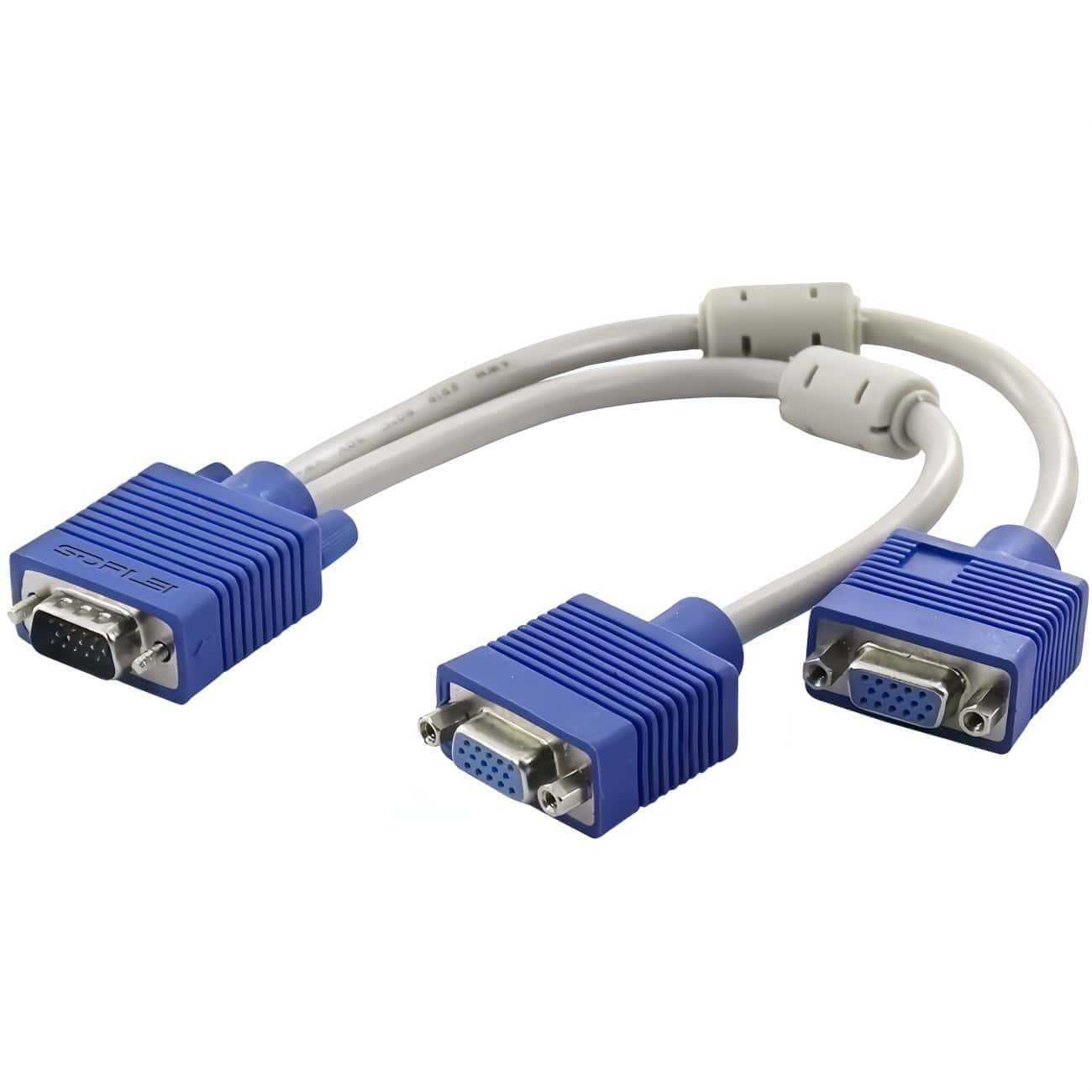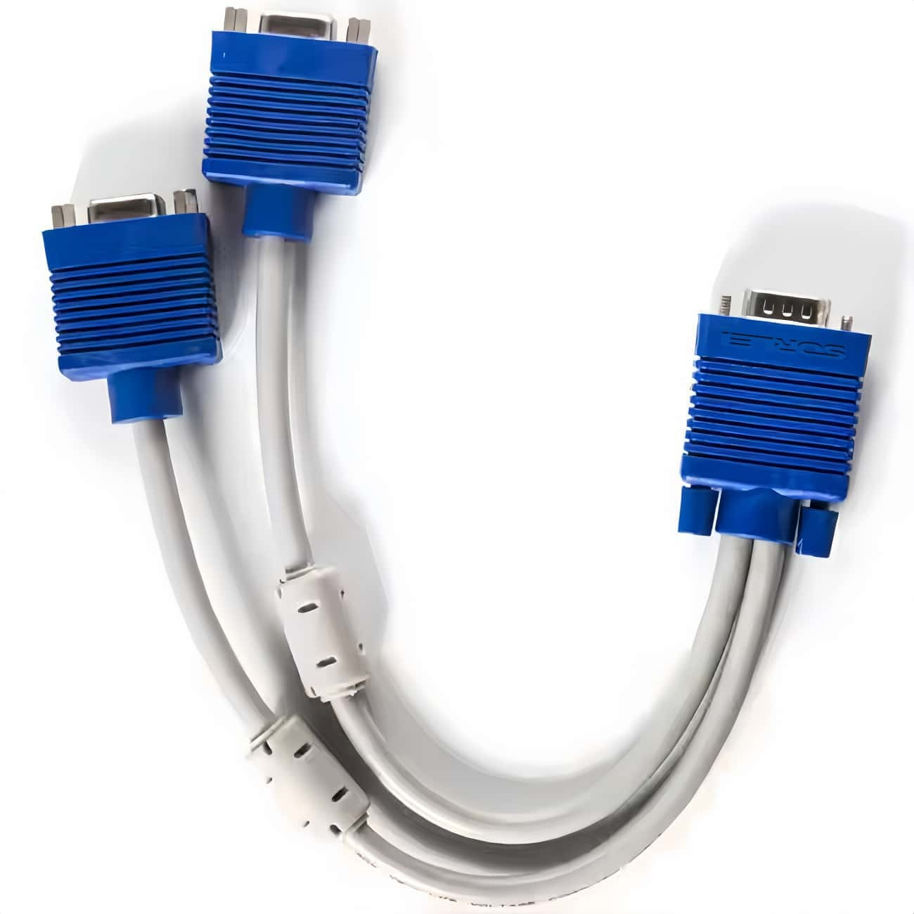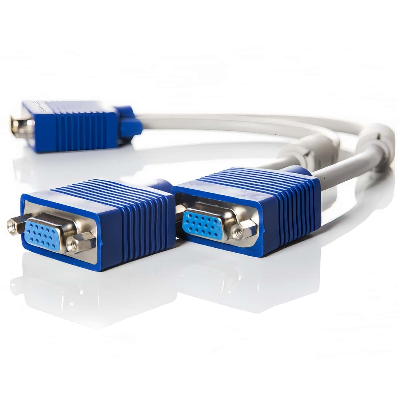 2.VGA Y-SPLITTER cable has a male connector that plugs directly into a computer; Two female VGA sockets on the cable connect to the VGA cables of two separate displays.