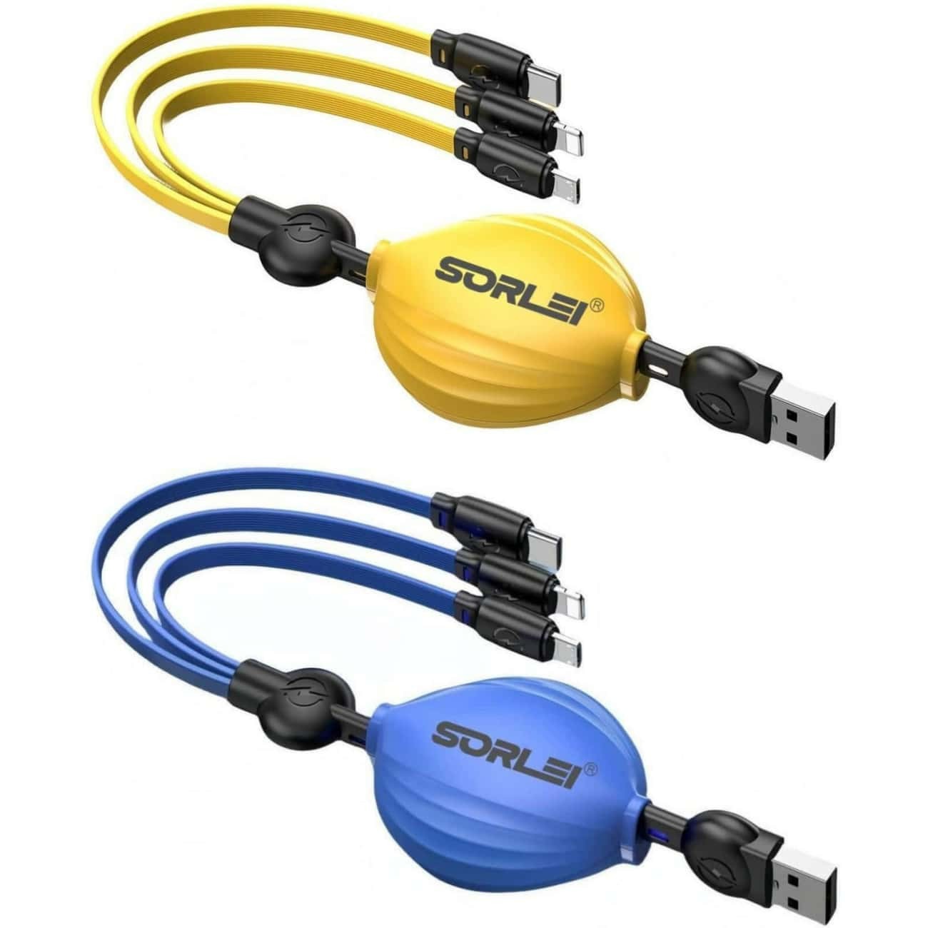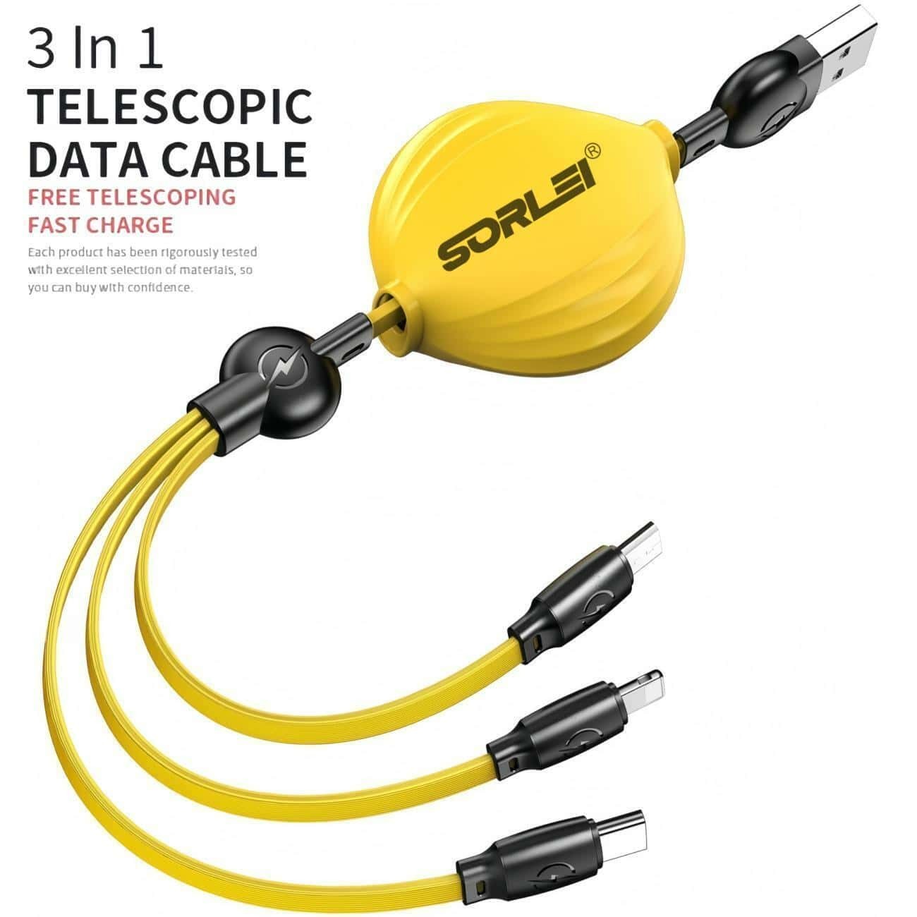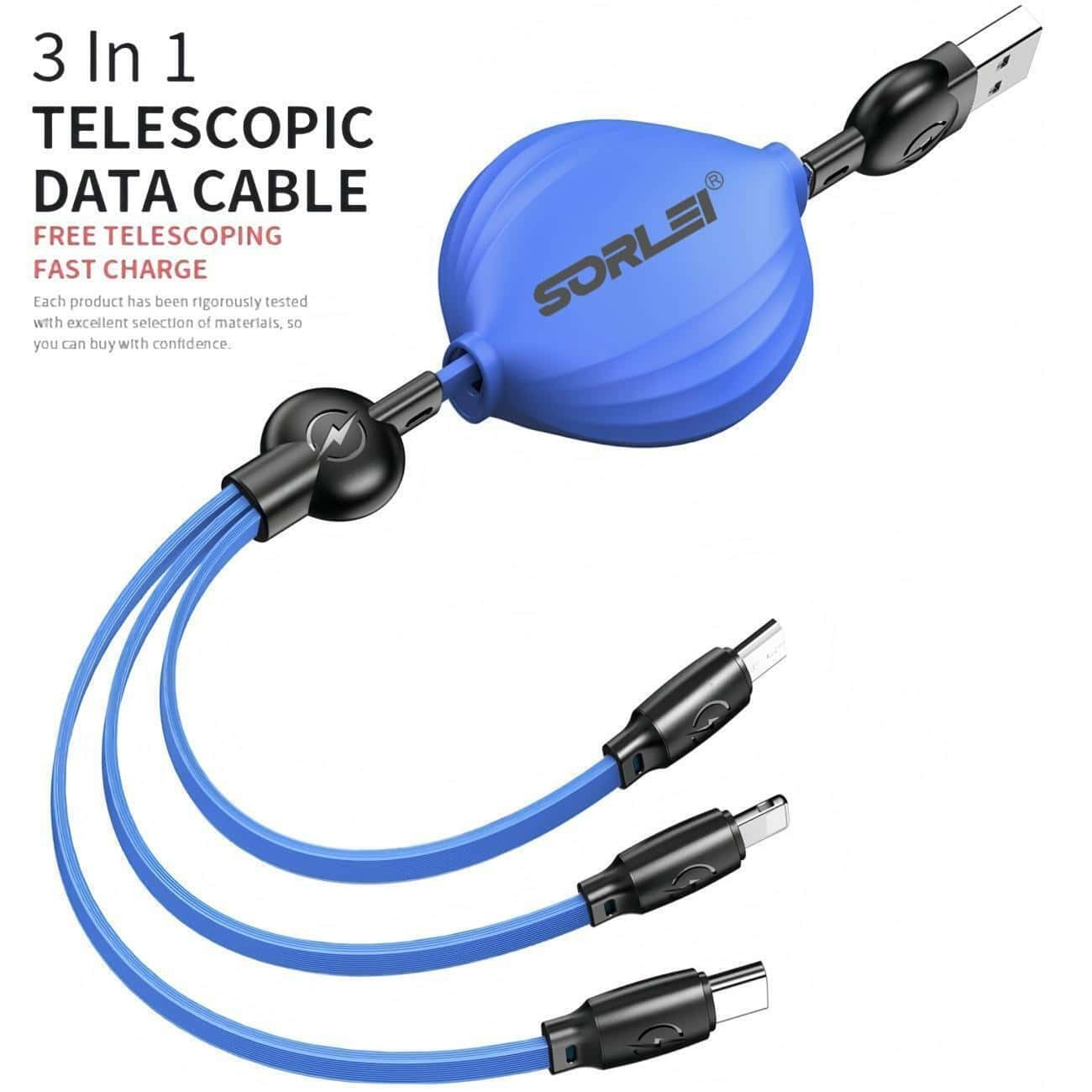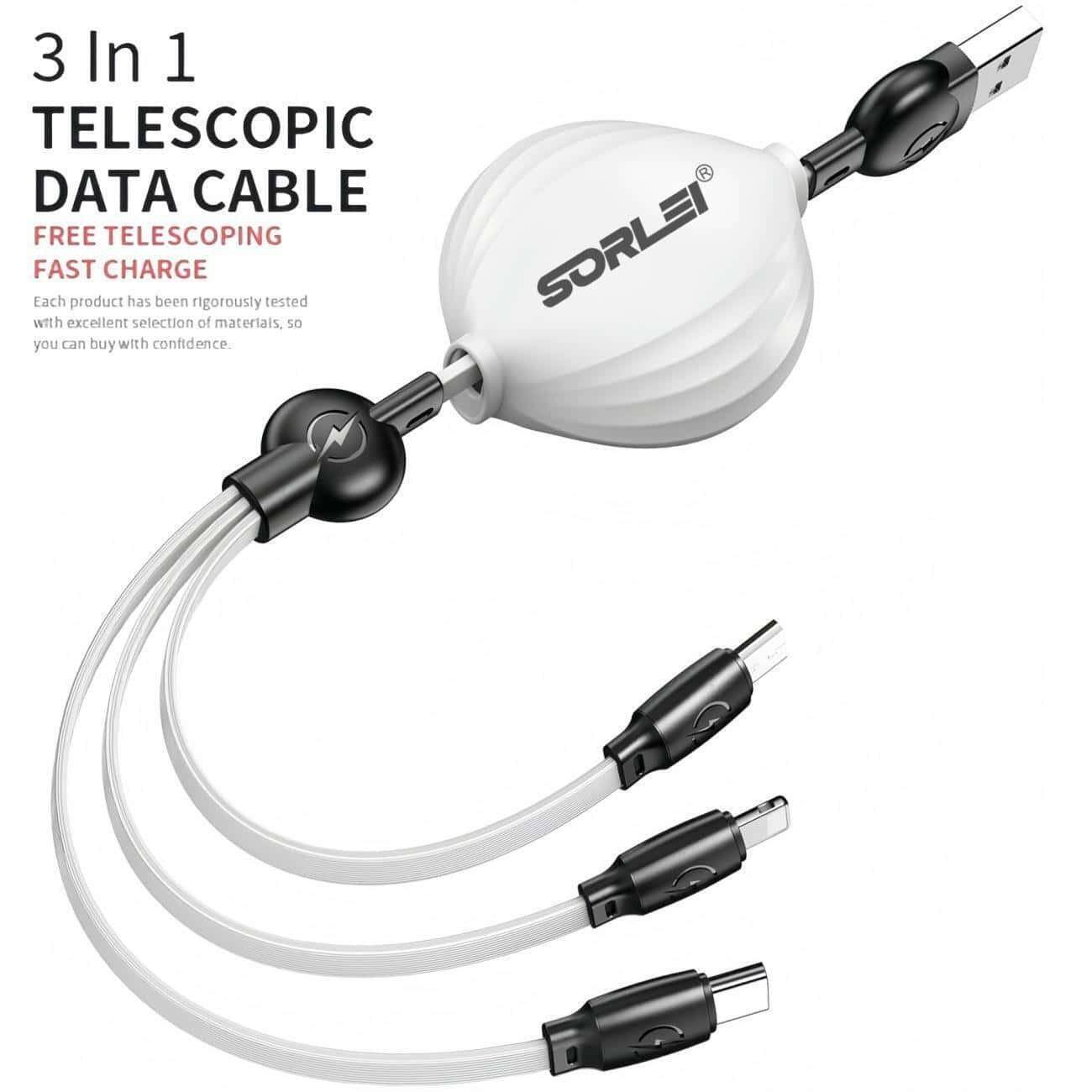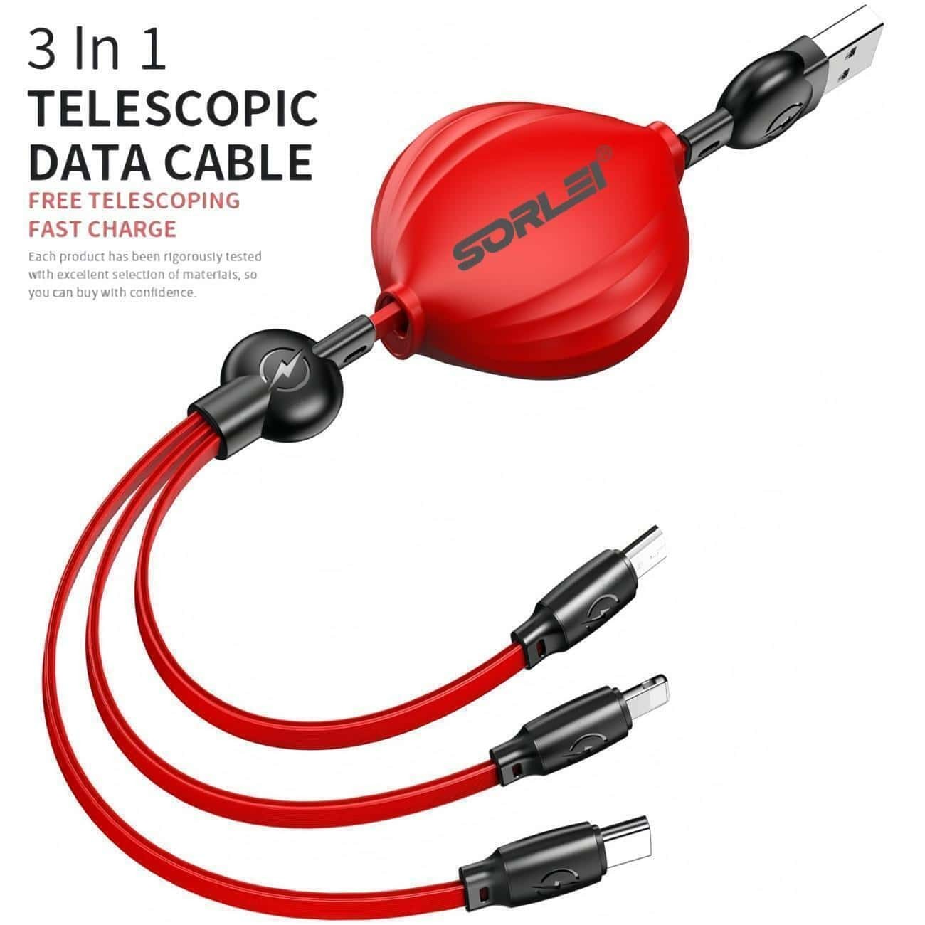 The maximum total output current of iOS is 2.4A, USB-C is 3.0A and Micro-USB is 2.4A (For total, not for each end)3-IN-1 Retractable Design.