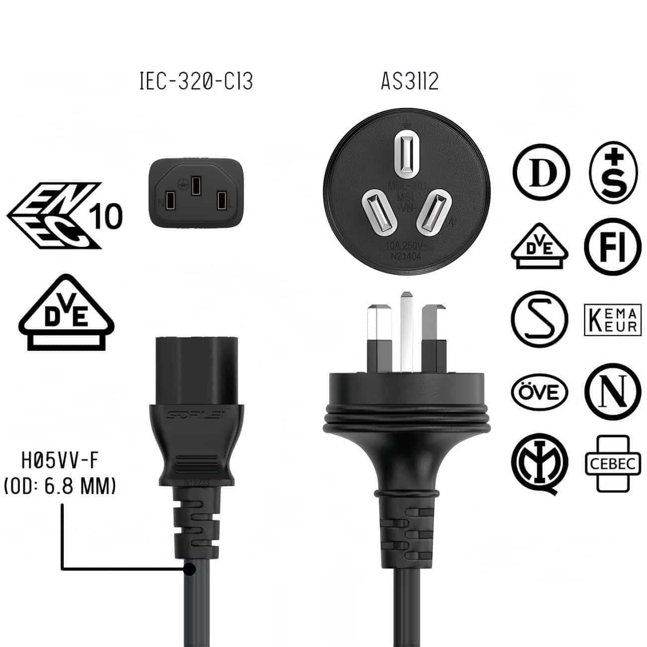 -Australia AS3112 10A standard plug IEC 60320 C13 molded 10A receptacle.