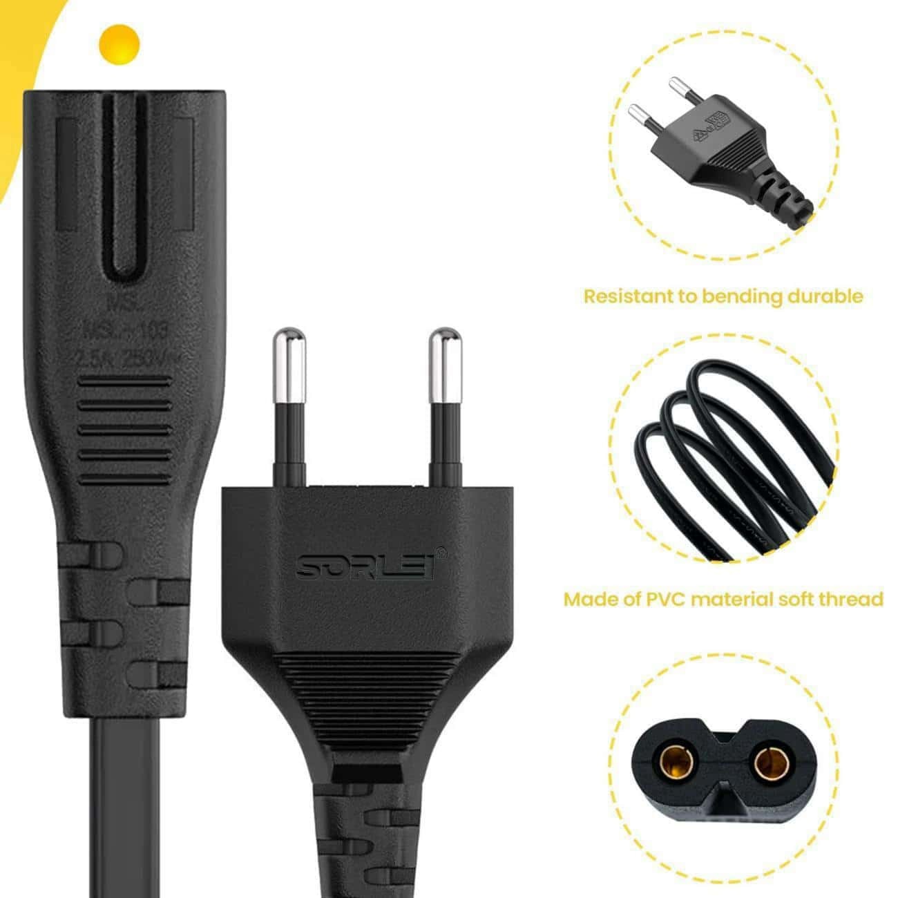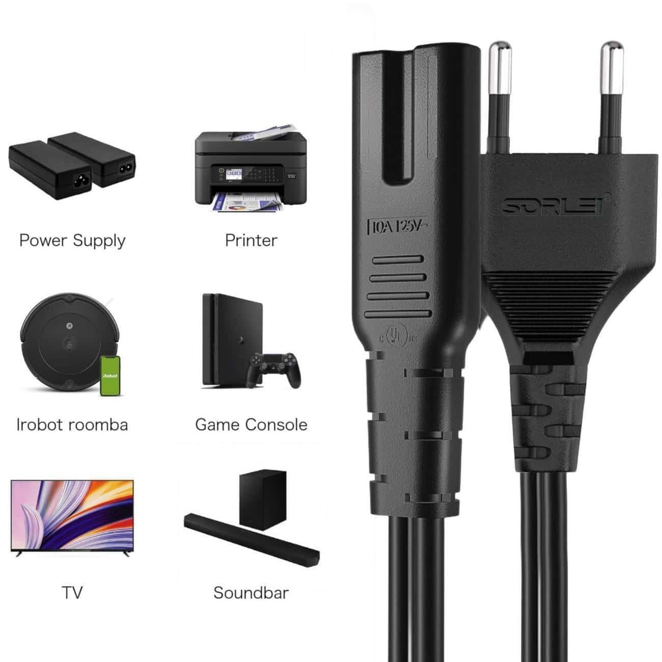 ⚡The Figure 8 power cord can be used for scanners, printers, LED TV monitors, projectors, powered speakers, other devices that have the 2 prong power connector.European Power Cord is rated for AC 250V. Connection is from a Europlug male end to a C-7 female end.