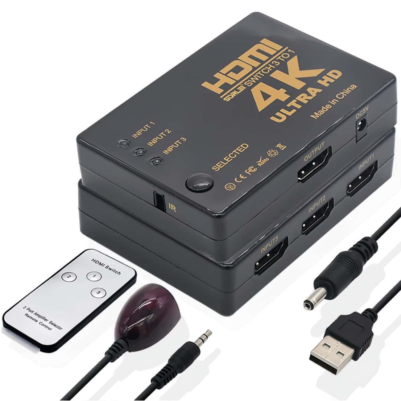 1x HDMI switcher, 1x remote control, 1x blister pack, 1x infrared receiver (optional), 1x USB power cable (optional).
